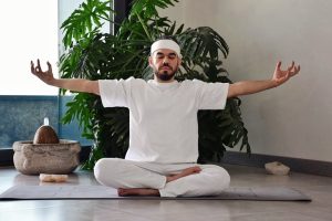 در پایان : با دم دست‌ها را با زاویه ۶۰ درجه به طرف بالا از هم باز کنید و 15 ثانیه نگه بدارید. بازدم کنید. تکرار کنید. بار سوم همان کار را با  ۳۰ ثانیه مکث انجام دهید. بازدم کنید.