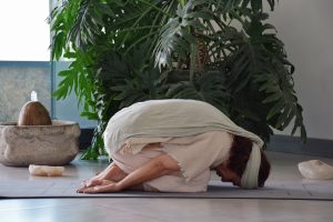 ۲.در حالت جنین قرار بگیرید. ستون فقرات را وانهاده کنید. همین که پیشانی‌تان به زمین رسید، مجسم کنید که به امنیت ساحل رسیده‌اید.