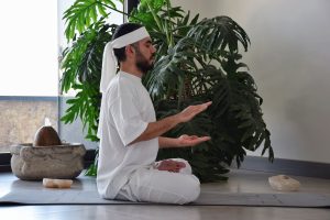 ۱.   چهارزانو بنشینید. آرنج‌ها را خم و بازوها را کنار قفسه سینه رها کنید. ساعدها مستقیم به طرف جلو و به موازات زمین گرفته می‌شوند.  کف دست راست به طرف پایین و کف دست چپ به طرف بالا قرار می‌گیرند. تنفس با بینی، با هشت شمارش مقطع دم و با هشت شمارش مقطع بازدم را انجام دهید. با هر شمارش نفس، دست‌ها را به تناوب بالا و پایین حرکت دهید.  حرکت دست‌ها کم است، یعنی از هم حدوداً بین ۱۵ تا ۲۰  سانتیمتر فاصله پیدا می‌کنند، انگار توپ‌بازی می‌کنید. با قدرت نفس بکشید.
