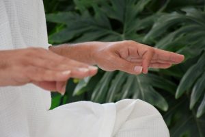 چهارزانو بنشینید. نوک انگشت شست به نوک انگشت اشاره وصل میشود. انگشتهای دیگر وانهاده هستند. با این مودرا، چشمها را ببندید، و دستها را به شکل زیر حرکت دهید. با به کارگیری نوک زبان بخوانید.