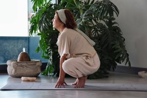 ۱. در حالت قورباغه قرار بگیرید ، روی پنجه‌های پا قرار بگیرید ، پاشنه‌ها را از زمین بلند کرده و به هم‌بچسبانید ، پنجه‌های دست را روی زمین بین زانوها قرار دهید ، سر را بالا نگه بدارید .با دم ، لگن را بالا بکشید و سر را بین زانو ها  رها کنید . پاشنه های پا را بالا نگه دارید . با بازدم به حالت اول برگردید . با نفس های عمیق حرکت را ادامه دهید .