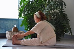 ۲. پاها را به جلو دراز کنید . خم شوید و شست پاها را با دو دست بگیرید . شست پاها را به عقب بکشید و  ۳۰ ثانیه نگه بدارید . با دم ، ستون فقرات را بالا بیاورید ، بازدم خم شوید.